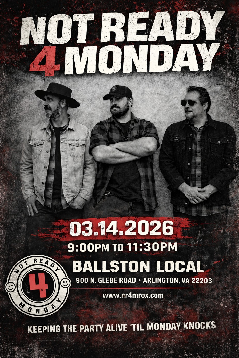 Get ready to light up your weekend with Not Ready 4 Monday, the ultimate cover band that brings a high-octane mix of alternative, indie, rock, and pop anthems from the last four decades.